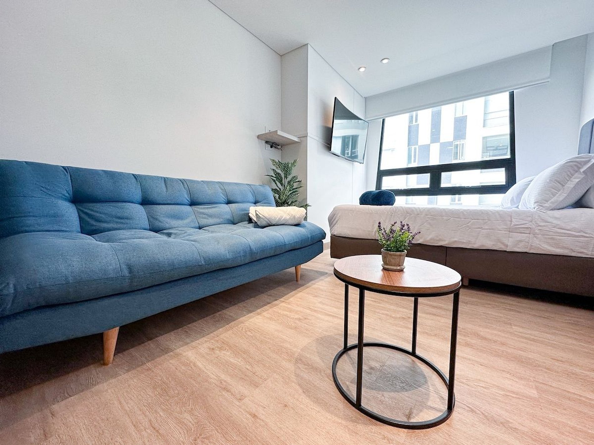 The studio apartment is fully equipped. It features a complete kitchen for cooking and storing food. The bed has a very comfortable queen mattress, and the TV provides access to all Netflix movies and series. Ask for the username and password. Additionally, it includes a desk with an ergonomic chair for work and a counter area with puff-type chairs for dining. Living room with sofa bed and a modern bathroom.