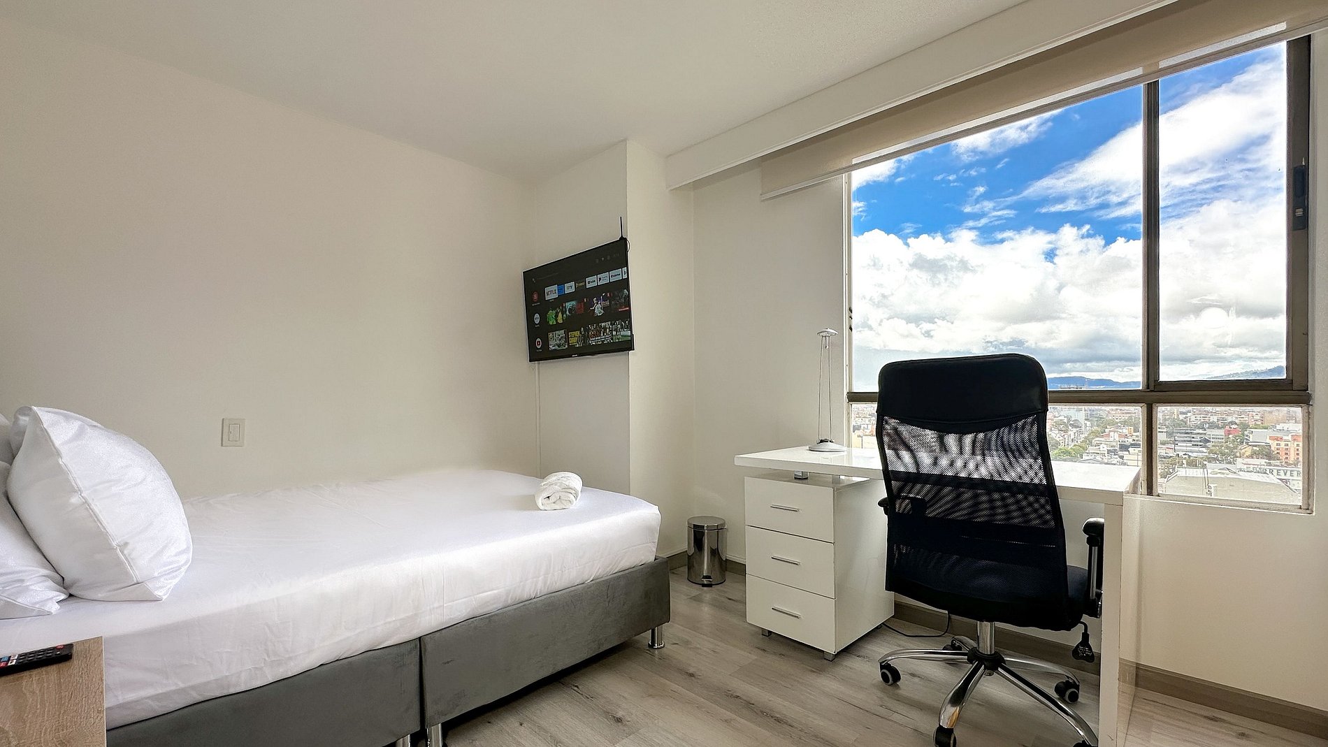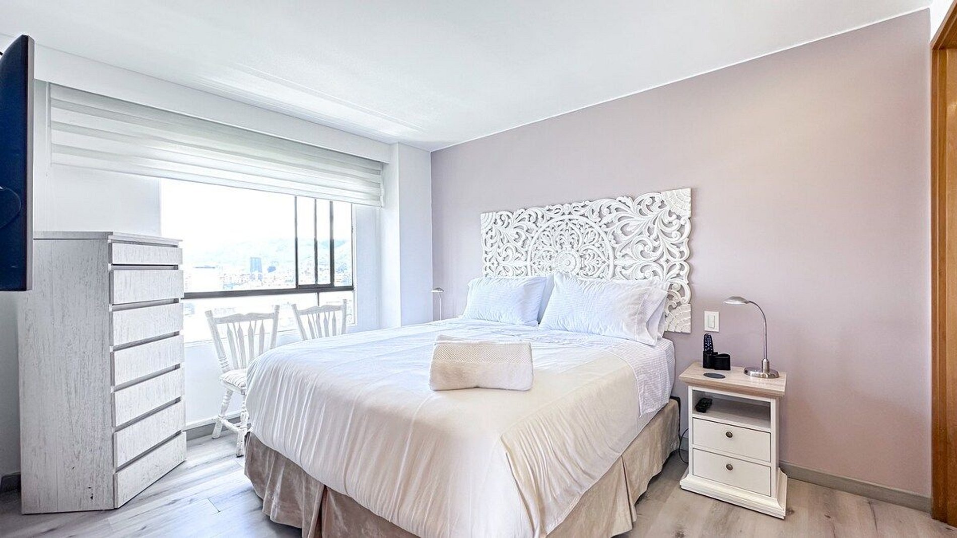 Two bedrooms, one study, and two bathrooms. Fully equipped kitchen so that you can cook, bake, and clean. Beautiful living room and dining area with a view of the city. Two parking spaces in line just for the stay.