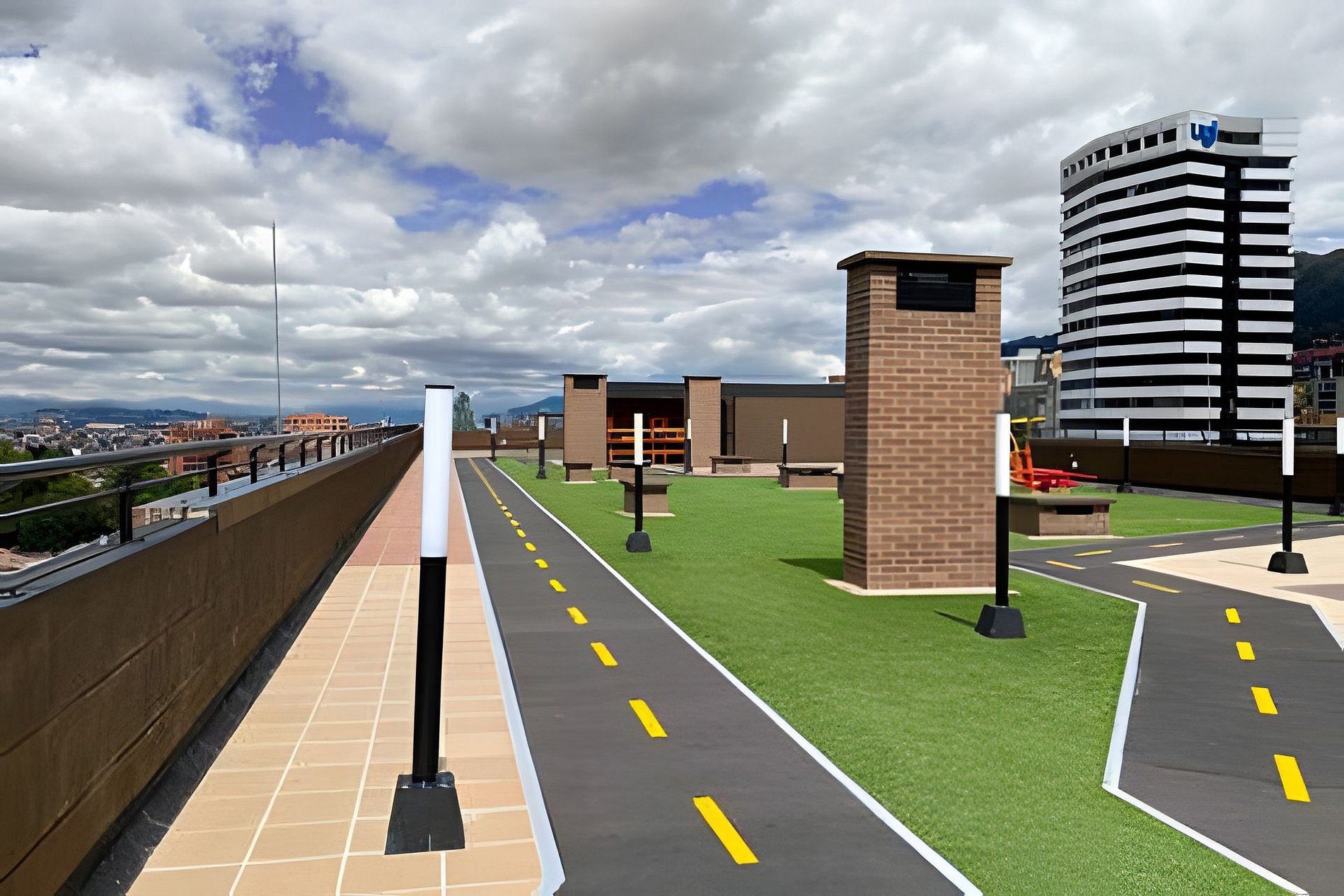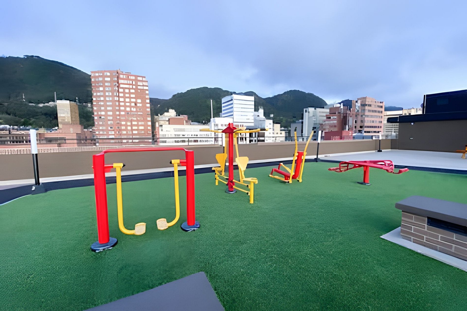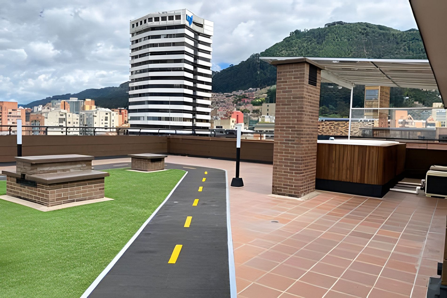 The building has a 360 terrace with a panoramic view of the city. It also has a concrete road on the terrace for running and a Gym Park. The common area on the second floor has a ping-pong table, a co-working space and if you need a parking spot just let us know so we can arrange it for you (it may have exra cost depending on availability).