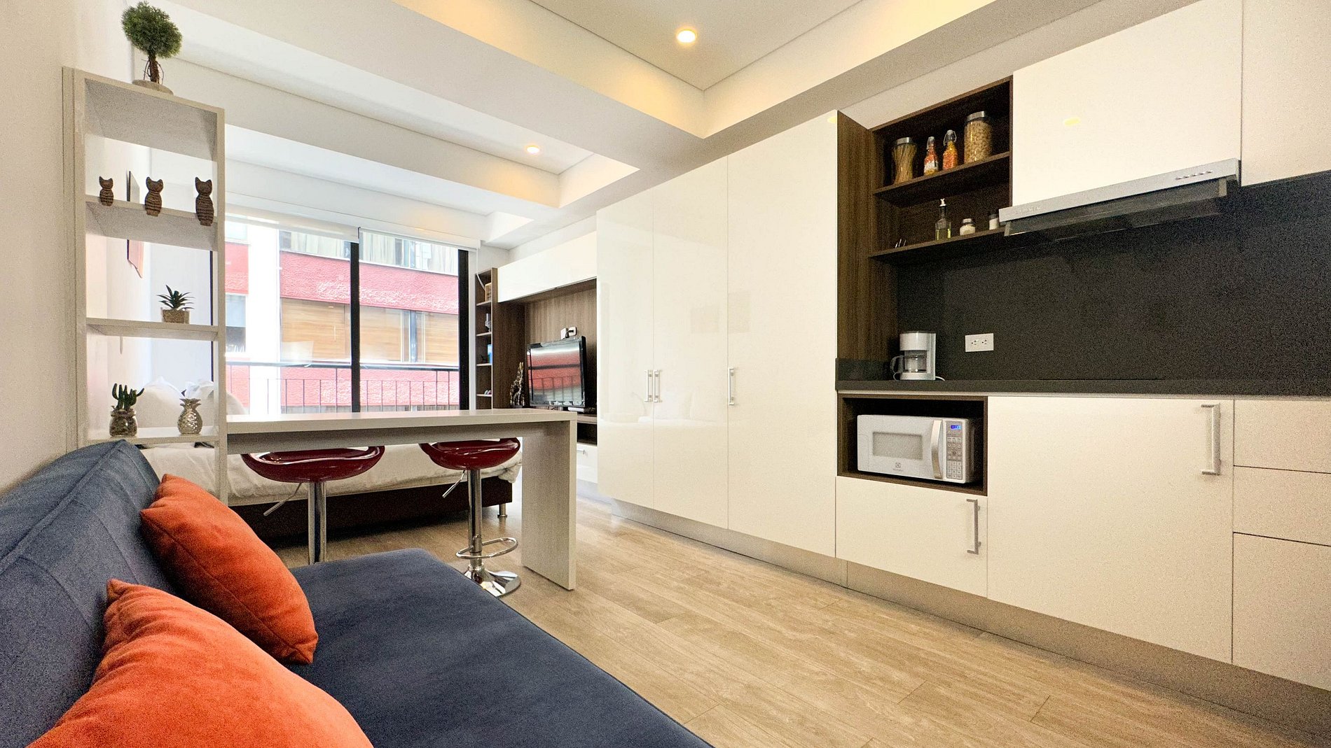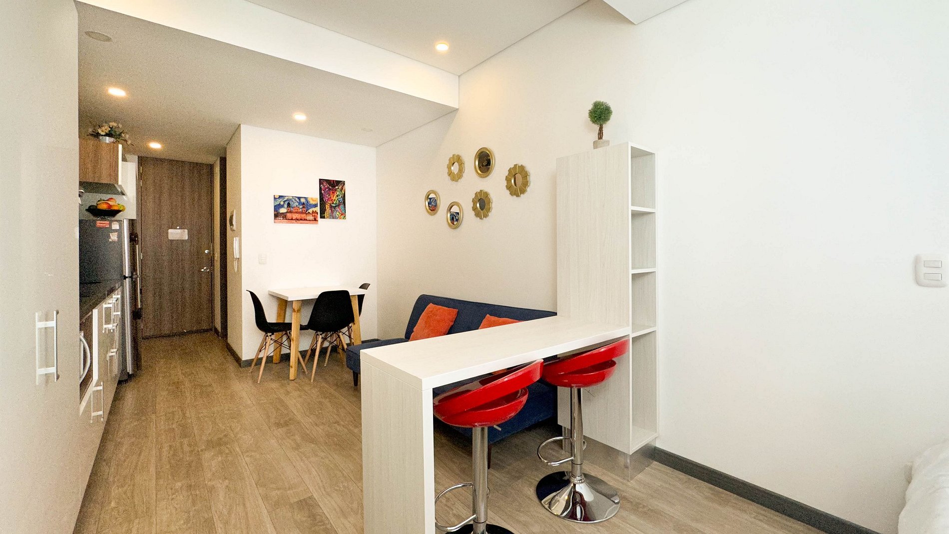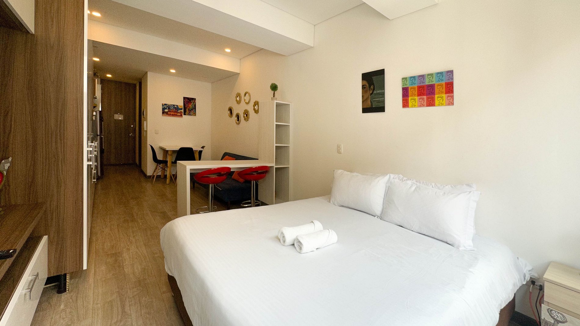 Este increible apartaestudio queda ubicado sobre la Avenida Caracas, una vía principal con transporte público (transmilenio), una vista privilegiada al occidente de Bogotá y con cercanía al Centro Internacional, universidades, restaurantes, el Parque Nacional, museos, y otros tantos sitios turisticos o de interés para cualquiera que quiera tener cerca la vibra de la ciudad. El apto cuenta con cama doble, cocina integral, lavadora, baño y todos los utensilios necesarios para cocinar.