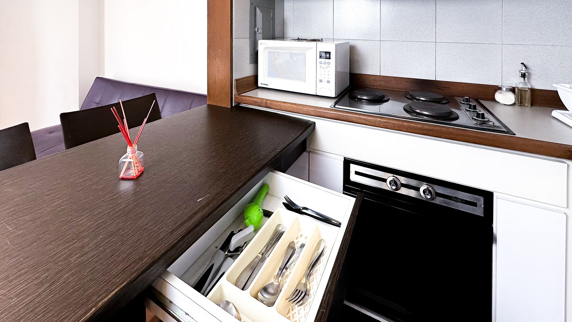 Nuestro apartaestudio es un espacio completo en todos los sentidos. La cocina está completamente equipada para que puedas cocinar y almacenar tus alimentos con comodidad. La cama, con un colchón KING, te garantiza un descanso placentero, y el televisor está conectado a una variedad de canales por cable. Además, el apartaestudio cuenta con un sofá cama adicional, una barra americana con sillas tipo bar para disfrutar de tus comidas, y un baño moderno y totalmente equipado.